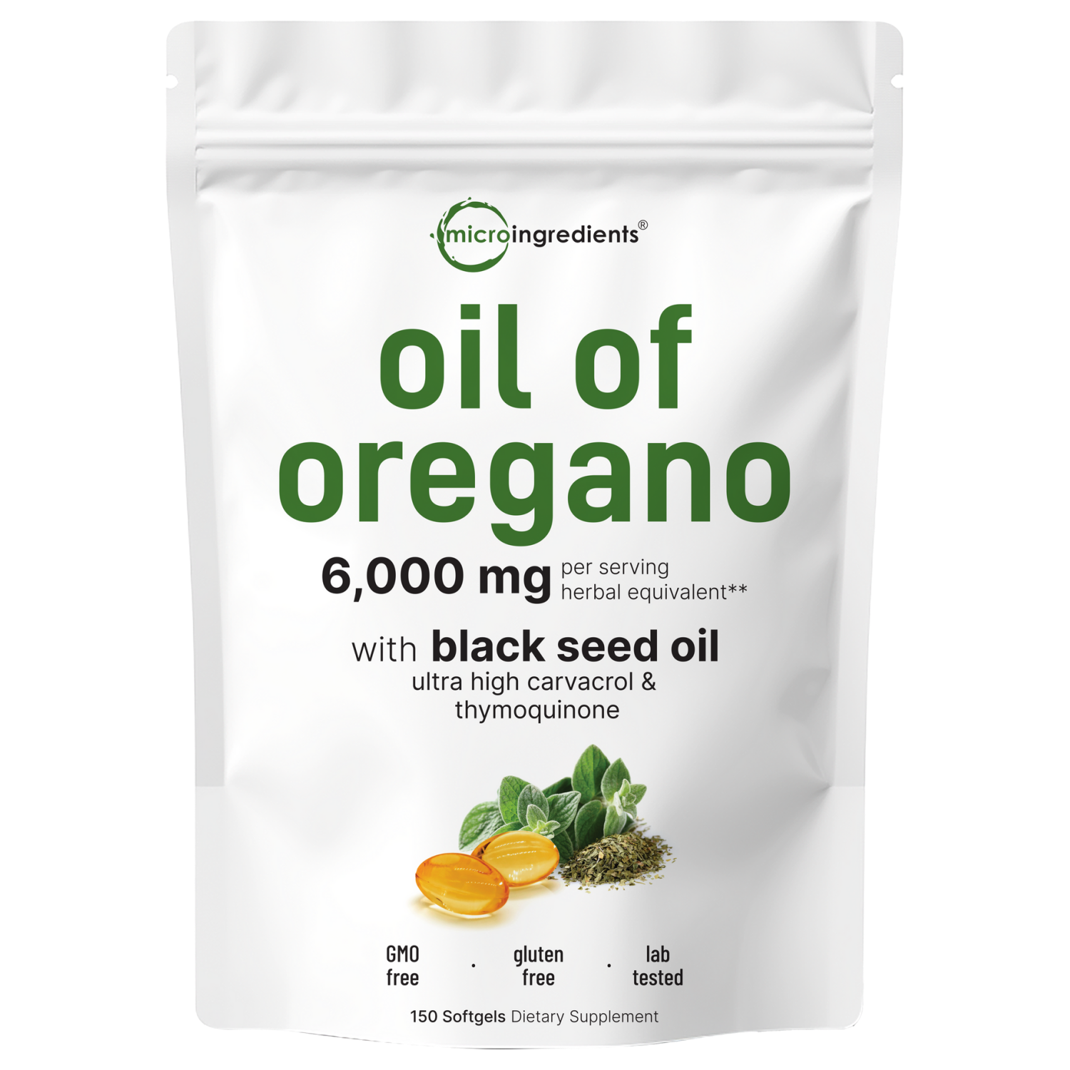 One pouch containing either 150 or 300 softgels of oil of oregano with black seed oil. Each softgel delivers a fresh 20:1 extract equivalent to 6,000 mg oregano oil and 200 mg black seed oil.